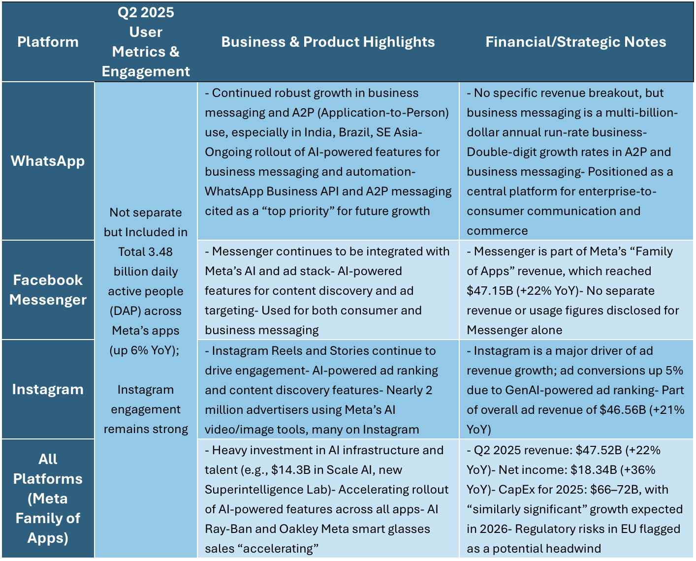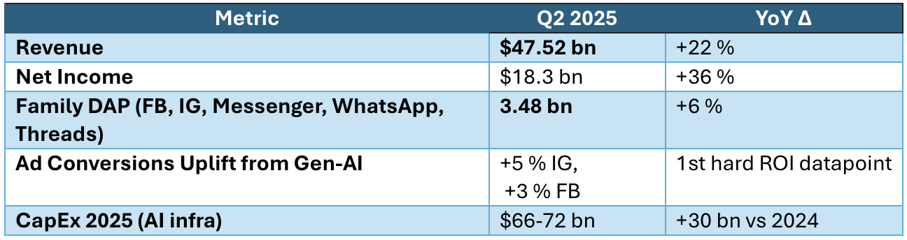 Meta’s financials dazzled Wall Street, with revenue surging 22% year-on-year to $47.5 billion and net income up 36% to $18.3 billion. But behind the headlines, it’s the scale and momentum of Meta’s messaging platforms that’s turning heads. Daily active users across Facebook, Instagram, Messenger, WhatsApp, and Threads reached a staggering 3.48 billion, up 6% from last year—a testament to the company’s global reach and the stickiness of its now family of apps.
