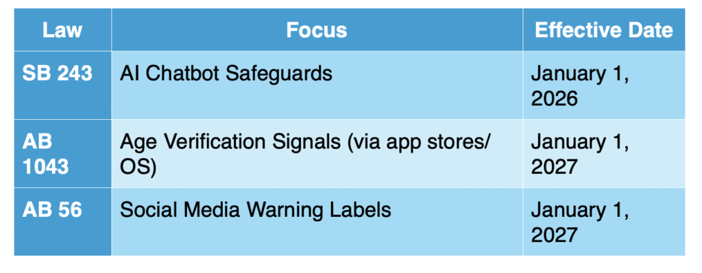 - 2026: SB 243 becomes effective; AI chatbot safety and reporting should be live. Pilot AB 1043 age signaling integrations.