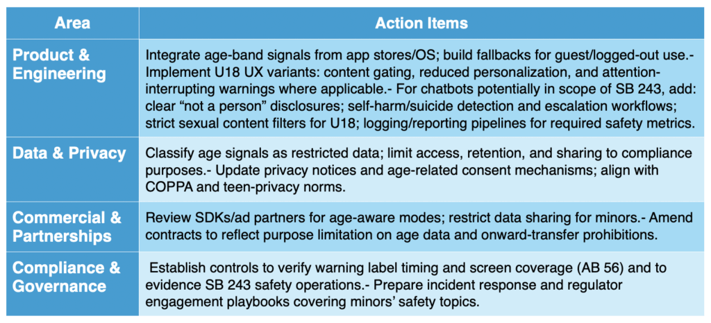 - Documentation: SB 243’s reporting expectations and AB 56’s UX timing/coverage thresholds will push teams to maintain telemetry, QA artifacts, and audit trails demonstrating compliance.